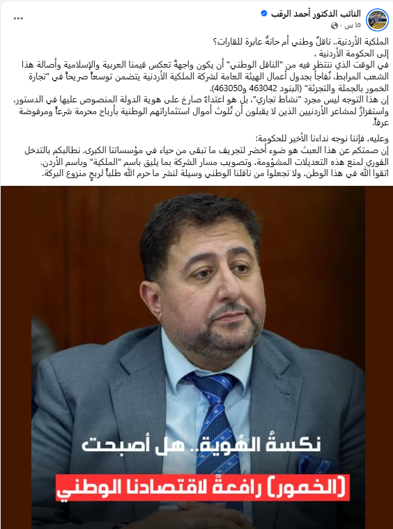 وقال الرقب في منشور عبر صفحته على "فيسبوك"، إن إدراج بنود تتعلق بالتوسع في "تجارة الخمور بالجملة والتجزئة" (463042 و463050) يثير تساؤلات حول دور الناقل الوطني، مضيفًا: "في الوقت الذي ننتظر فيه من الملكية الأردنية أن تكون واجهة تعكس قيمنا العربية والإسلامية، نفاجأ بمثل هذه التوجهات".