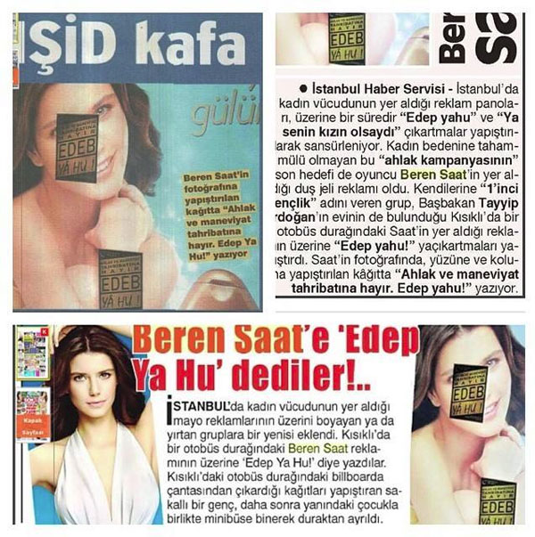 أحدث المتضررين من هذه الحملة، كانت النجمة التركية بيرين سآت الشهيرة بـ«فاطمة»، حيث فوجئت الممثلة بلصق صور مكتوب عليها «الأدب ياهو» على أجزاء من جسدها العاري في أحدث إعلان صورته لصالح أحد منتجات صابون الاستحمام.
