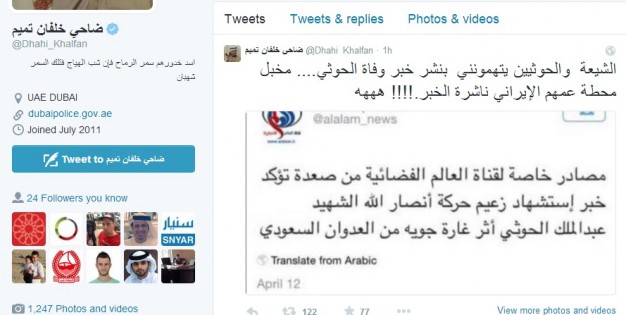 سرايا - نشر نائب رئيس الشرطة والأمن العام في إمارة دبي الفريق ضاحي خلفان تغريدة على صفحته الرسمية في موقع تويتر للتواصل الاجتماعي سخر من خلالها من اتهام الحوثيين له بنشر خبر مقتل زعيم جماعة أنصار الله عبد الملك الحوثي.