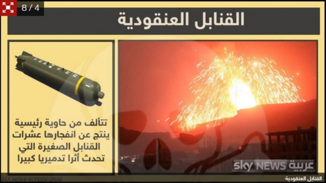 أما القنابل العنقودية، فتأتي على شكل حاويات رئيسية ترمى من الطائرات وعندما تنفجر يخرج منها عشرات القنابل الصغيرة بما يشبه عنقود العنب، ولذلك سميت بالعنقودية. استخدمت هذه الأسلحة من قبل الأميركيين في العراق والإسرائيليين في الأراضي المحتلة.