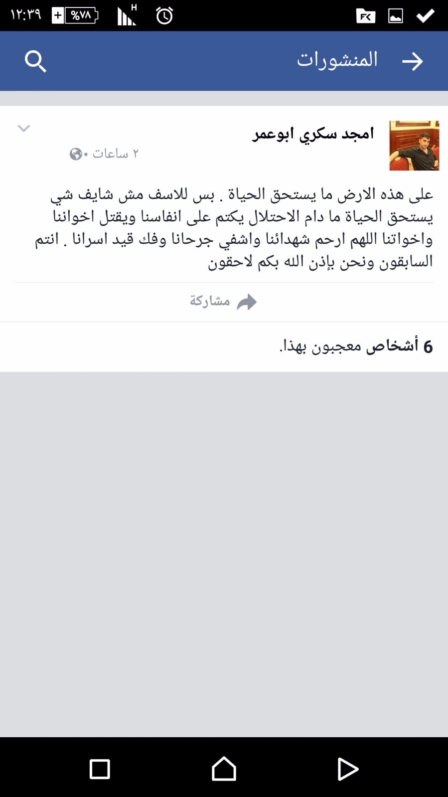 سرايا - سرايا - خاص - كتب الشهيد امجد السكري 35 عاما من بلدة جماعين قضاء نابلس على صفحته على الفيسبوك " صباحكم نصر باذن الله" اشارة منه انه كان ينوي لتنفيذ عملية كما كتب عبارات يتمنى فيها موته على الشهادة وطالباً من الجميع مسامحته وانه على الارض ما يستحق الحياة لكنه لا يرى ما يستحق حياته .