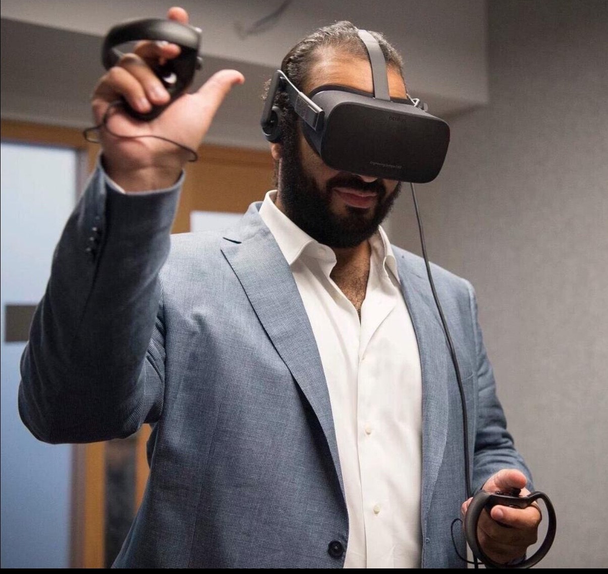 وفي صورة أخرى يظهر الأمير محمد وهو يرتدي نظارات الواقع الافتراضي، وفي صورة ثالثة تلتقطها الكاميرا أثناء الجولة داخل أروقة الشركة في وادي السيليكون حيث مقر أكبر شركات التقنية في العالم. وشهدت الزيارة مباراة حماسية بين الأمير محمد وزوكربيرغ في لعبة "البينغ بونغ".