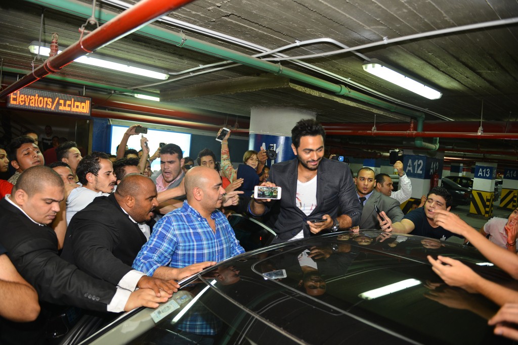 دائمًا ما يظهر الفنان تامر حسني في حفلاته وعروض أفلامه بحرسه الخاص، الذين يحيطون به بشكل يقلل من تدافع المعجبين به.