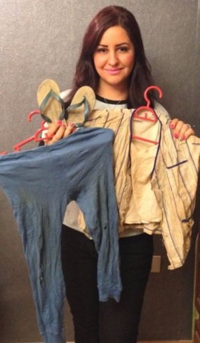 ظهرت هديل خير الله في الصورة وهي تحمل بيدها ملابس دورها في فيلم " العفاريت".
