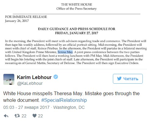 وجاء هذا الخطأ من قبل موظفي البيت الأبيض لمرات عدة في الجدول الرسمي للقاء بين تيريزا ماي والرئيس الأميركي، دونالد ترامب، بواشنطن، الجمعة الماضي، الذي أجري في إطار زيارتها إلى الولايات المتحدة، حيث كتب في الوثيقة اسم رئيسة الوزراء البريطانية من دون الحرف الإنكليزي "h"، أي كـ"Teresa May" بدلا من الاسم الصحيح "Theresa May".
