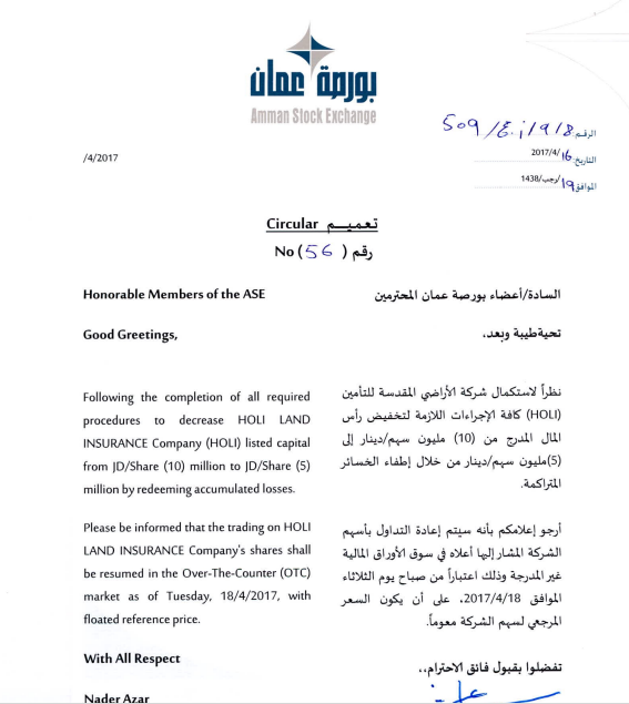 قرر المدير التنفيذي لبورصة عمان نادر عازر وبحسب وثيقة رقم 8/9/أ.ع / 509 بتاريخ 16/4/2017 ، وبعد استكمال شركة الارضي المقدسة للتأمين (HOLI) كافة أجراءات تخفيض رأس المال المدرج من (10) مليون سهم /دينار الى (5)مليون سهم / دينار وذلك لاطفاء الخسائر المتراكمة .