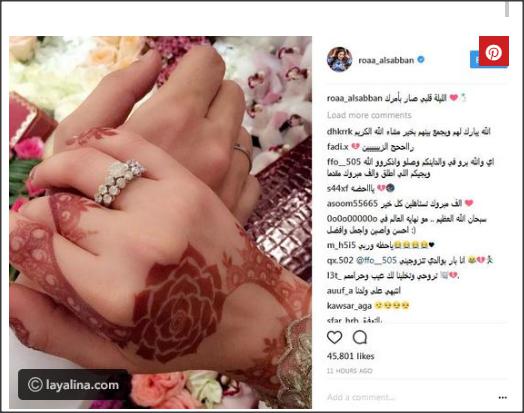 نشرت العروس الإعلامية رؤى الصبان صوراً لها من عقد قرانها عبر حسابها الخاص على موقع الانستقرام وأرفقتها بتعليق قالت فيه :"الليلة قلبي صار بأمرك " وقصدت برسالتها خطيبها الإعلامي حمود الفايز.
