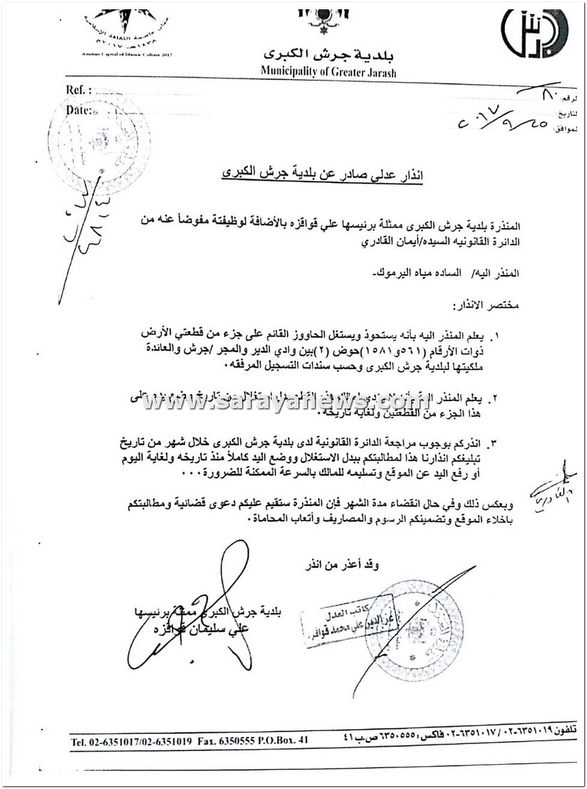 و طالب رئيس البلدية علي قوقزة بكتاب مخاطبة رسمية لمراجعة الدائرة القانونية في البلدية و دفع كامل المبالغ المترتبة على مياه جرش منذ تاريخ إقامة ذلك الخزان على الارض المملوكة للبلدية ، وفق كتابه ، وإمهال شركة مياه اليرموك التي تتبع لها مديرية مياه جرش شهراً منذ تاريخ التبليغ بالإنذار العدلي ، و في حال انقضاء الشهر سيتم رفع قضية في المحاكم ضدهم للمطالبة بالتعويضات المالية.