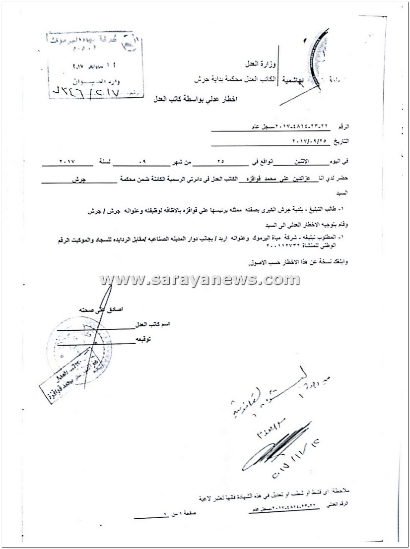 و قال مدير مياه جرش و عجلون المهندس منتصر المومني في تصريحات لسرايا : انه تفاجىء بوجود انذار عدلي لإخلاء مكان الخزان الذي مساحته 5 ألاف متر مربع ، و هو الشريان الرئيسي المغذي لمحافظة جرش بأكملها و مقام على تلك الارض منذ حوالي 30 عاماً .