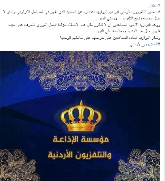 قدم مدير التلفزيون الأردني ابراهيم البواريد اعتذاره عن المشهد الذي ظهر في المسلسل الكرتوني والذي لا يمثل سياسة ونهج التلفزيون الاردني المتزن.