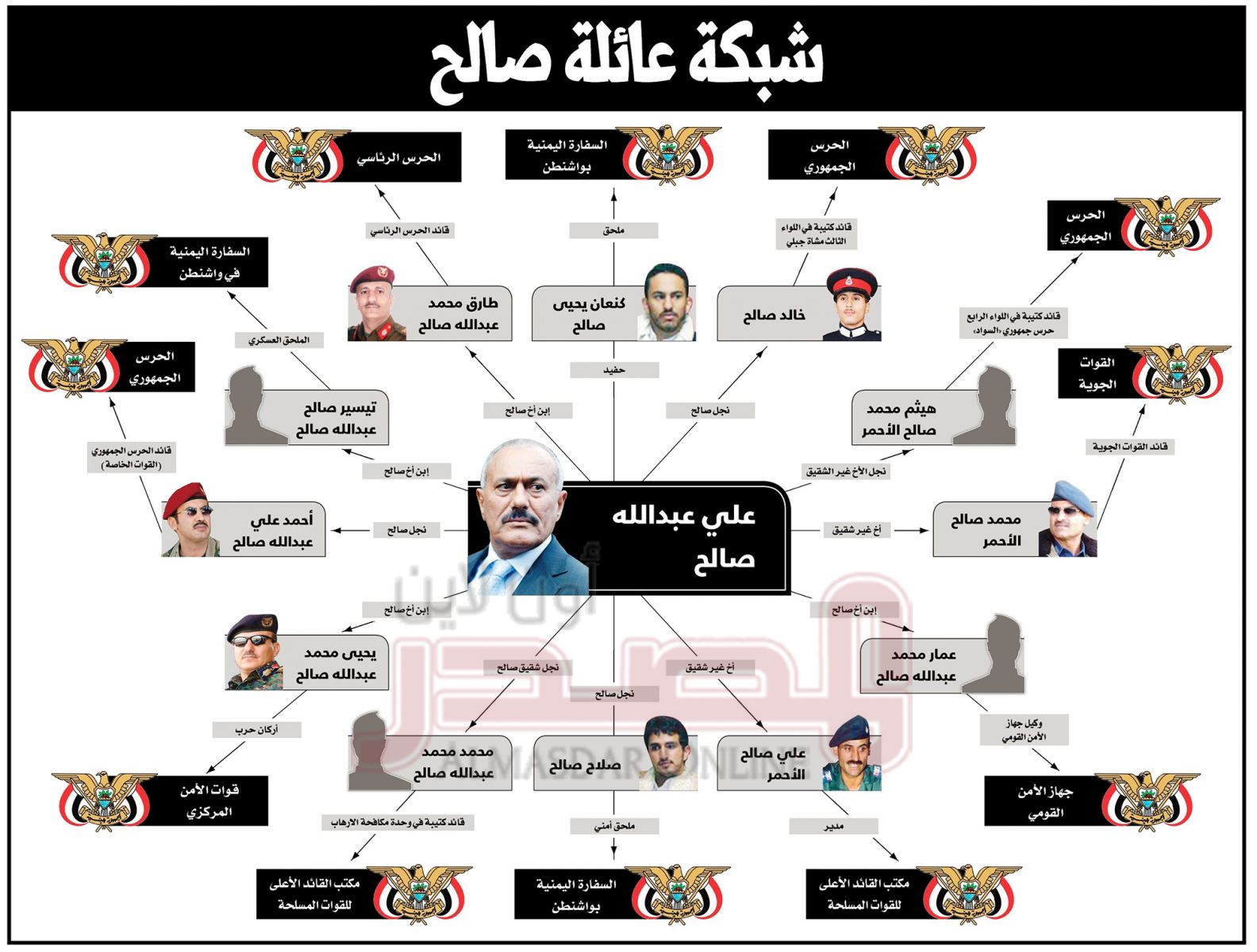 ومحمد عبدالله صالح، الذي شغل منصب أول قائد لقوات الأمن المركزي وتوفي عام 2001، وأبناؤه من الذين اعتمد عليهم صالح كثيرا، حيث لازمه طارق الذي كان قائد حمايته الخاصة حتى اللحظات الأخيرة، وسط أنباء عن مقتله أيضا في الاشتباكات التي دارت.