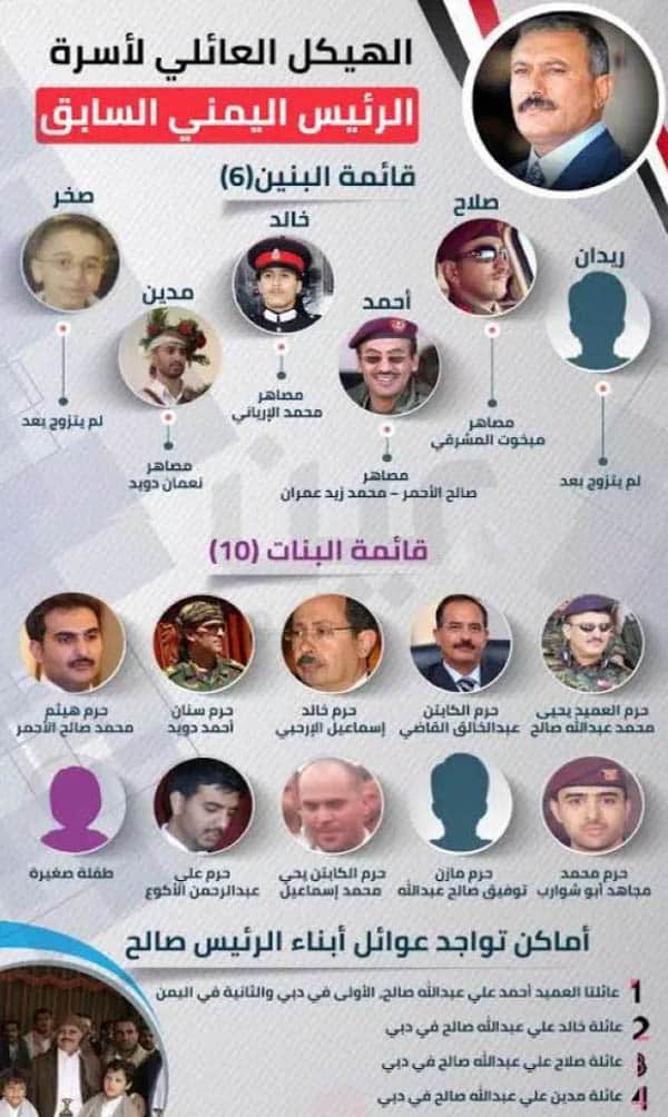 سرايا - يحيط عائلة الرئيس اليمني السابق علي عبدالله صالح، جدار من السرية، حيث حرص على إبعاد عائلته عن الأضواء، باستثناء نجله الأكبر أحمد، وأبناء أشقائه الذين كان لهم دور بارز أثناء نظام حكمه.