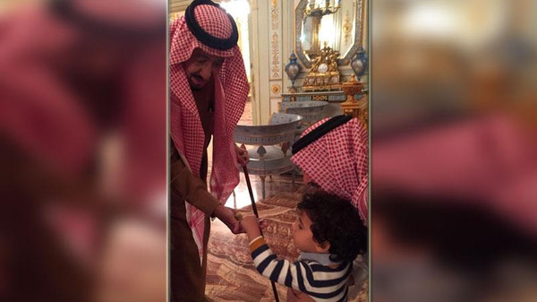 تناقل مغردون صورة عفوية لخادم الحرمين الشريفين، #الملك_سلمان، وهو يقدم حلوى بيده للطفل خالد بن بندر بن فيصل بن بندر ذي السنتين، وخلفه جده إلى أمه الأمير عبدالله بن فيصل لدى زيارة الملك للأسرة، وهي عادة اعتاد عليها الملك سلمان لأفراد أسرته من آل سعود.