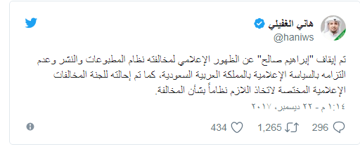وكشف المتحدث باسم الإعلام، هاني الغفيلي، عبر صفحته الرسمية “تويتر”، أن “إيقاف إبراهيم الصالح عن الظهور الإعلامي جاء لمخالفته نظام المطبوعات والنشر وعدم التزامه بالسياسة الإعلامية بالسعودية، كما تمت إحالته للجنة المخالفات الإعلامية المختصة لاتخاذ اللازم نظامًا بشأن المخالفة”.