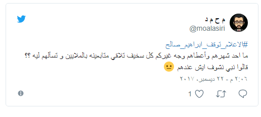 وشارك ناشطون عبر موقع التواصل “تويتر” في التعبير عن رأيهم بشأن قرار الإعلام، حيث اعتبر كثيرون أن الكوميديا اليوم باتت سطحية وتعاني من خلل، وذلك من خلال هاشتاغ #الاعلام_توقف_ابراهيم_صالح، حيث علق “طارق العزيز”: “أتصور أن ثقافة الضحك والكوميديا بعامة فيها خلل، حيث إننا نضحك من خلال السخرية على طرف آخر والاستهزاء فيه واستصغاره؛ أوالتهريج والاستهبال الفارغ بأحسن الأحوال، وليس من خلال صناعة وصياغة موقف وحدث طريف أو ساخر يثير الضحك منه لا عليه!”.