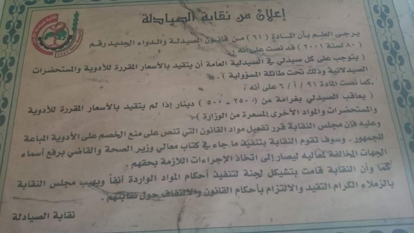 بالوقت ذاته أكد الكيلاني أن "النقابة وزعت على صيدليات المملكة كافة تعليمات هامة حيال مخالفة أسعار قائمة الدواء وأهمية الإلتزام بها".
