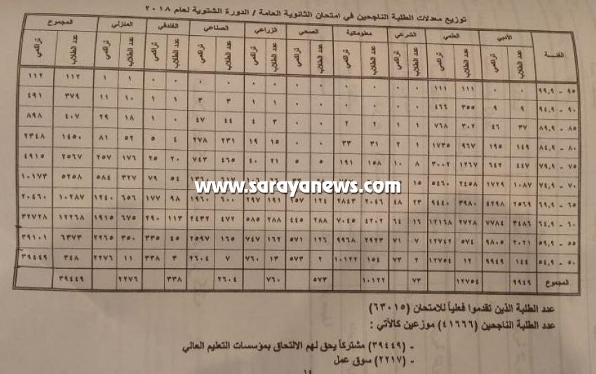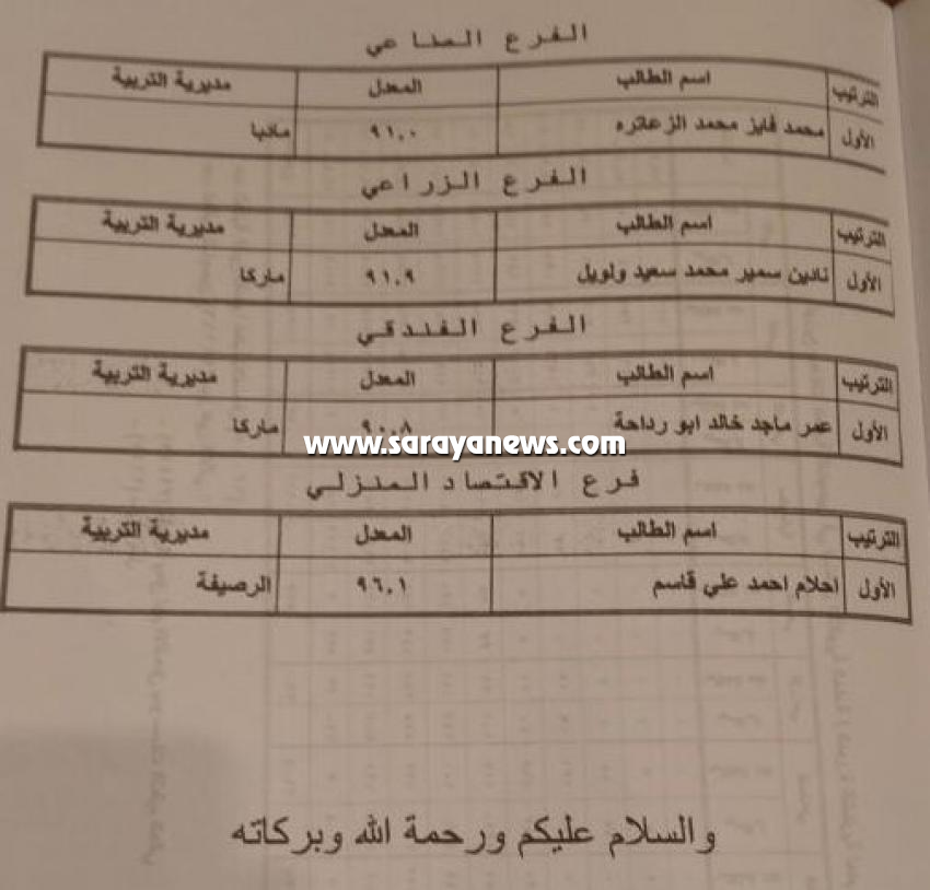 اعلن ويرز التربة و التعليم عمر الرزاز اسماء اوائل المملكة و هم على النحو التالي :نور جريس المعدل 99،5 - عجلونعمار الرجوب 98,3 - لواء الجامعةاسماعيل عبد القادر 98،1 - الشونة الجنوبيةالادبي :دانية امجد الزغاري 94،2 - عمانعلا نعيرت 93,7 - وادي السيرشيماء ابو السعود 92،9 - ماركاالادارة :سلسبيل الجالودي 86،3 - اربدملاك محمود الجبور 86،3 - اربدرحمة سهيل مقدادي 84،9 - الكورةالتعليما لصحي :بلقيس صندوقة : 79،8 الشرعي : احمد دوايه : 85 - ماركاالصناعي :محمد الزعاترة : 91 - مادباالزراعي :نديم سعيد : 91,9 المنزلي : احلام علي قاسم 96,1 سرايا - اعلن ويرز التربة و التعليم عمر الرزاز اسماء اوائل المملكة و هم على النحو التالي :