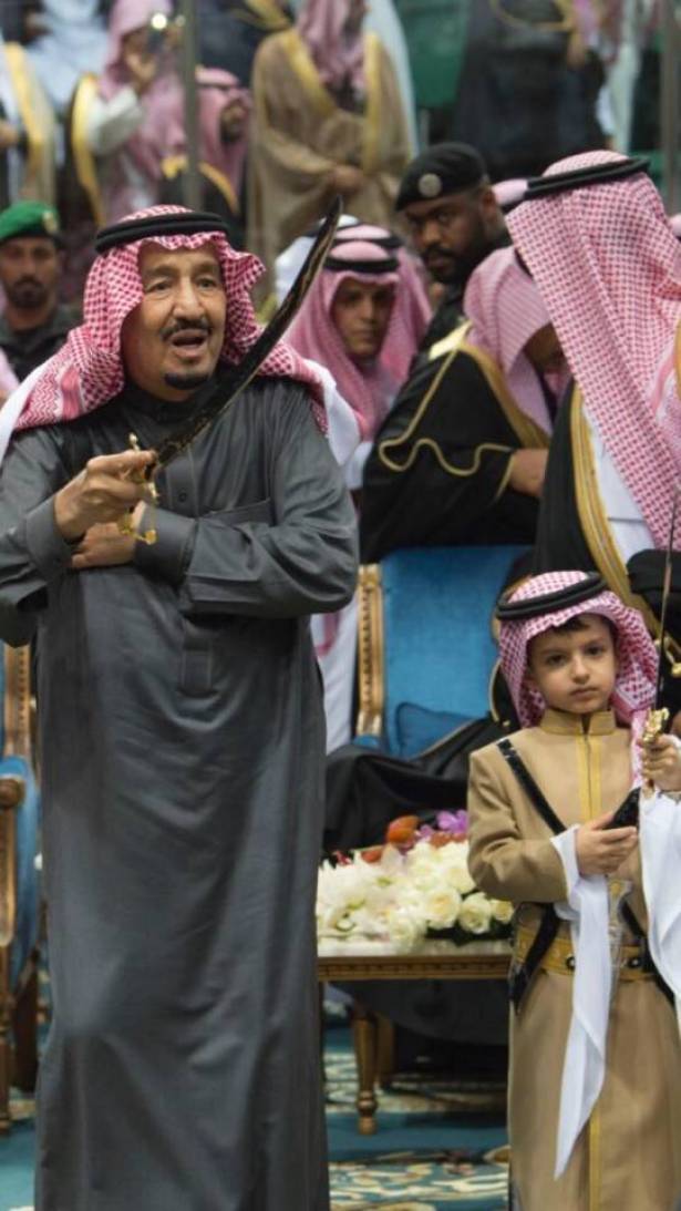 سرايا - وقف الطفل عبدالعزيز بن خالد بن سلمان، وهو نجل السفير السعودي في واشنطن خالد بن سلمان، بجانب جدّه الملك السعودي سلمان بن عبدالعزيز، في "العرضة" السنوية ضمن "مهرجان الجنادرية الوطني للتراث والثقافة" ليحاكي رقصة الملوك على صوت فرقة "الدرعية" وهم يردِّدون "منِّي عليكم ياهل العوجا سلام" في رقصة من رقصات الانتصار الشهيرة.