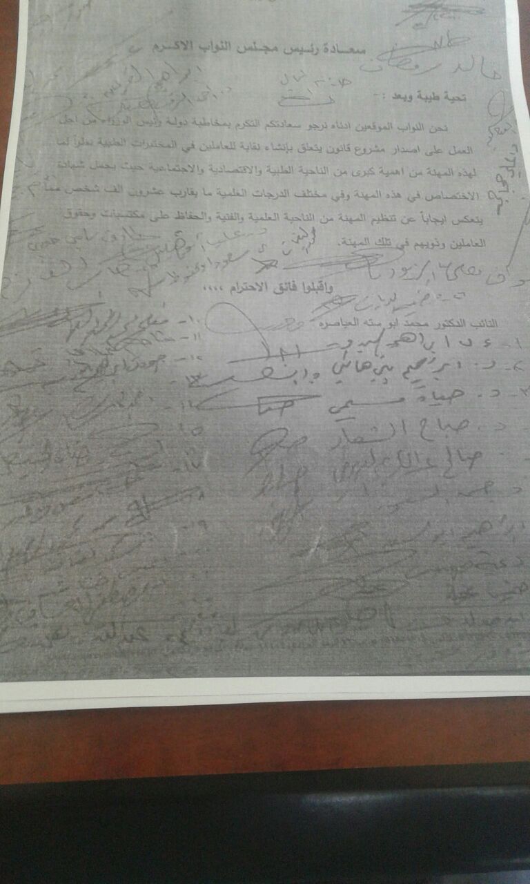سرايا - تعلن الهيئة الإدارية لجمعية المختبرات و التحاليل الطبية لكافة الزملاء العاملين في مهنة المختبرات عن البدء بتحقيق ما كان حلماً الى حقيقة بتوقيع اكثر من ٧٠ نائباً و (التواقيع مستمرة) على مذكرة مرفوعة من سعادة النائب الدكتور محمد ابو سته العياصرة لتأسيس النقابة للعاملين في مهنة المختبرات و التحاليل الطبية.