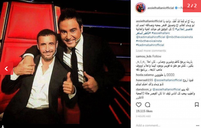 ونشر على تطبيق "انستغرام"، صورة جمعته بالساهر من كواليس برنامج "ذا فويس"، وعلّق عليها قائلا: "ربَ اخٍ لم تَلدهُ لكَ أمّكَ وانت يا ابو وسام الغالي اخ وصديق افتخر بمحبه وصداقته اتمنى لك كل التوفيق في حياتك الفنية والعائلية عاصي الحلاني كاظم الساهر".