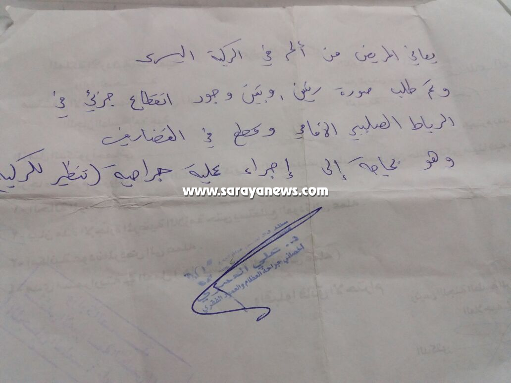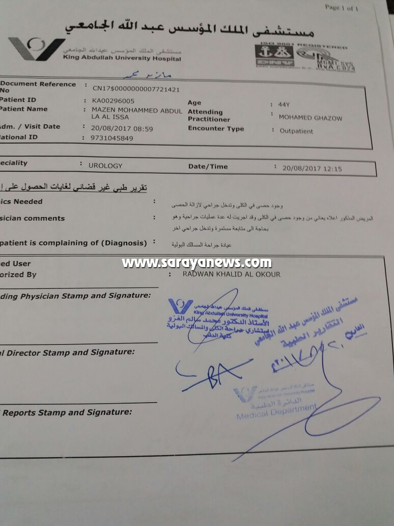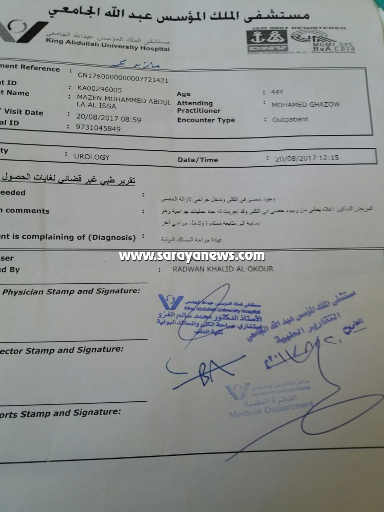 واضاف انه ترتب عليه فاتورة بقيمة (52) دينار وهي عالقة في مستشفى الملك المؤسس الجامعي وتم رفض العلاج حتى يتم سداد المبلغ.
