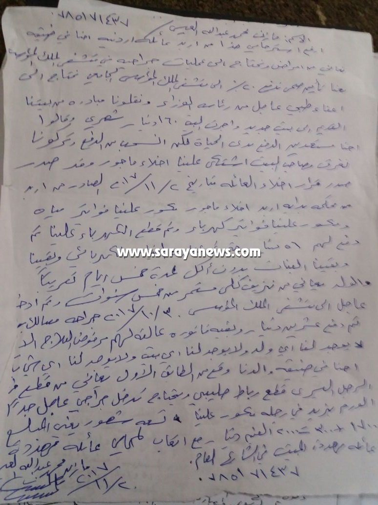 واشار الى انه سيتم اخلاء العائلة إلى الشارع العام والمبيت به العام ، مناشدا اهل الخير بالوقوف لى جانبه .