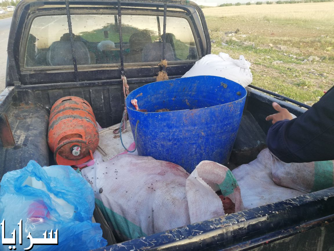 سرايا - استطاعت كوادر دائرة الشؤون الصحية في بلدية اربد الكبرى وبمرافقة الشرطة الملكية لحماية البيئة ضبط احدى المركبات التي تقوم بنقل رؤس الأغنام "الذبايح" بطريقة غير سلمية وغير صحية على الأطلاق خاصة مع هذه الاجواء التي تشهد ارتفاع كبير في درجات الحرارة وفق ما اكد مدير دائرة الشؤون الصحية في بلدية اربد الكبرى الدكتور محمود الشياب.