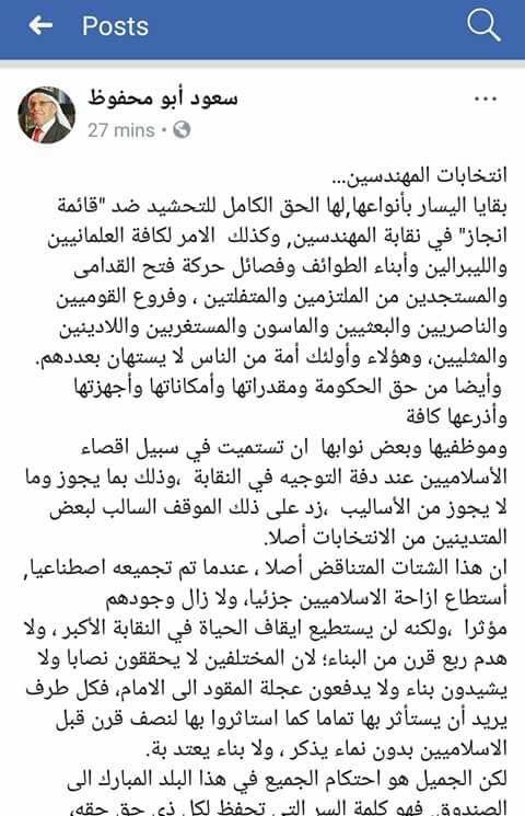 و قال النائب سعود ابو محفوظ عبر صفحته الشخصية بموقع التواصل الاجتماعي فيسبوك : ان جميع التيارات السياسية حشدت ضد قائمة انجاز ومنها العلمانيين والليبرالين وأبناء الطوائف والبعثيين والماسون والمثليين و الحكومة وأجهزتها و نواب و غيرهم ، حيث جاء حديث ابو محفوظ لاذعاً و فيه جمل غاضبه جراء خسارة الاسلاميين في انتخابات المهندسين.