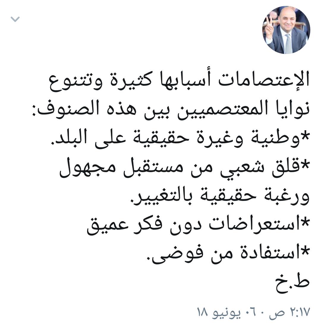 سرايا - خاص - وصف النائب طارق خوري في تغريده له عبر منصة التواصل الاجتماعي تويتر بأن الاعتصامات الدائرة في محافظات المملكة بعدة انواع على حد تعبيره .
