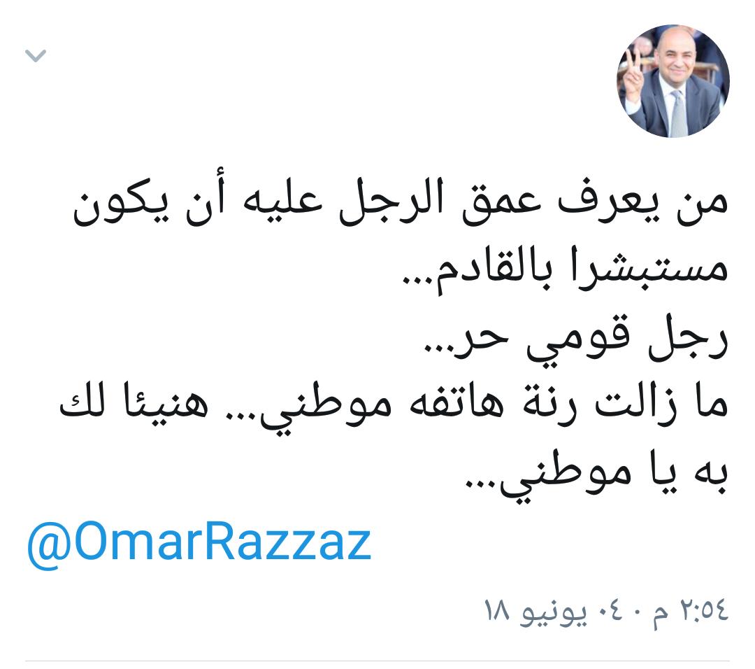 ويذكر بأن النائب طارق خوري قد أطلق في وقت سابق تغريدة خاصة تتعلق برئيس الوزراء المكلف الدكتور عمر الزراز حيث أشاد من خلالها بشخصية الرزاز وما يحمله من فكر وطني كبير ، مشيرآ بالتغريده بأنه(الرزاز) يحمل فكرآ قوميآ حرآ.