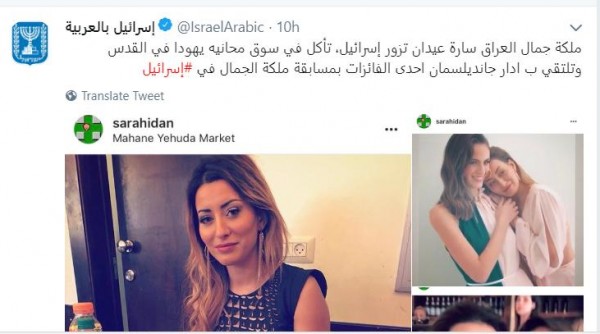 وكتب الحساب التابع للخارجية الإسرائيلية: "ملكة جمال العراق سارة عيدان تزور إسرائيل، تأكل في سوق محانيه يهودا في القدس وتلتقي ب ادار جانديلسمان احدى الفائزات بمسابقة ملكة الجمال في #إسرائيل".