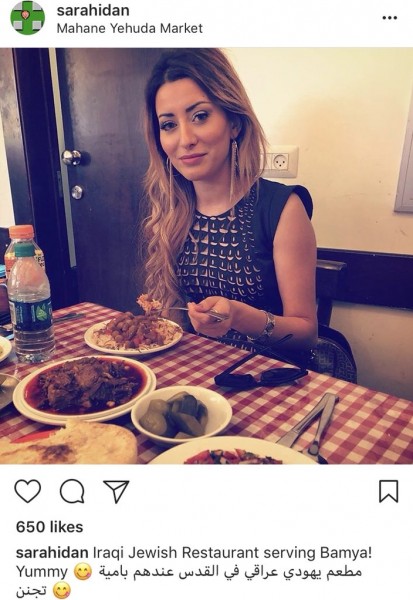والتقطت سارة صورة لها نشرتها عبر انستغرام و كتبت الى جانبها "مطعم يهودي عراقي في القدس عندهم بامية تجنن".
