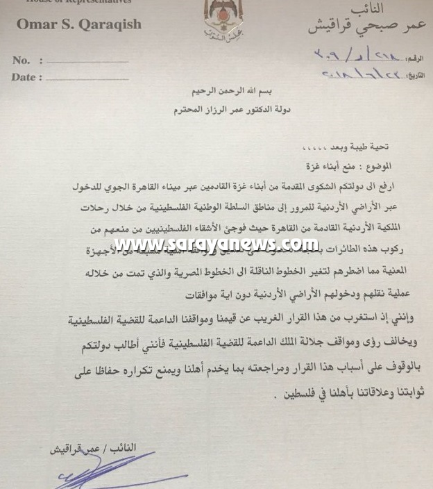 محمد النواطير - وجه النائب عمر قراقيش رسالة لرئيس الوزراء الدكتور عمر الرزاز ، طالبه خلالها انصاف ابناء غزة القادمين عبر ميناء القاهرة الجوي للدخول عبر الاراضي الاردنية لفلسطين .