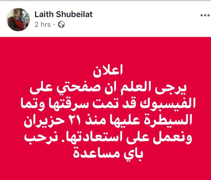 رصد - اكد المهندس ليث الشبيلات نقيب المهندسين الاسبق ان صفحته الشخصية على موقع التواصل الاجتماعي فيس بوك ، تعرضت للسرقة.