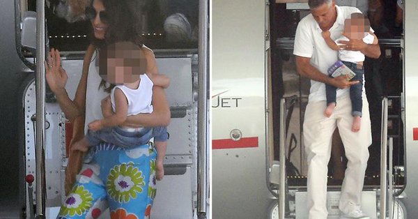وخرج كلوني من طائرته حاملا ابنه ألكسندر الصغير وكتاب قصص، في حين أطلت علم الدين حاملة ابنتهما، إيلا. وبدت علم الدين مبتسمة عند خروجها، بينما تميزت إطلالة كلوني بشاربه المتناسق مع شعره الأبيض المصفف.