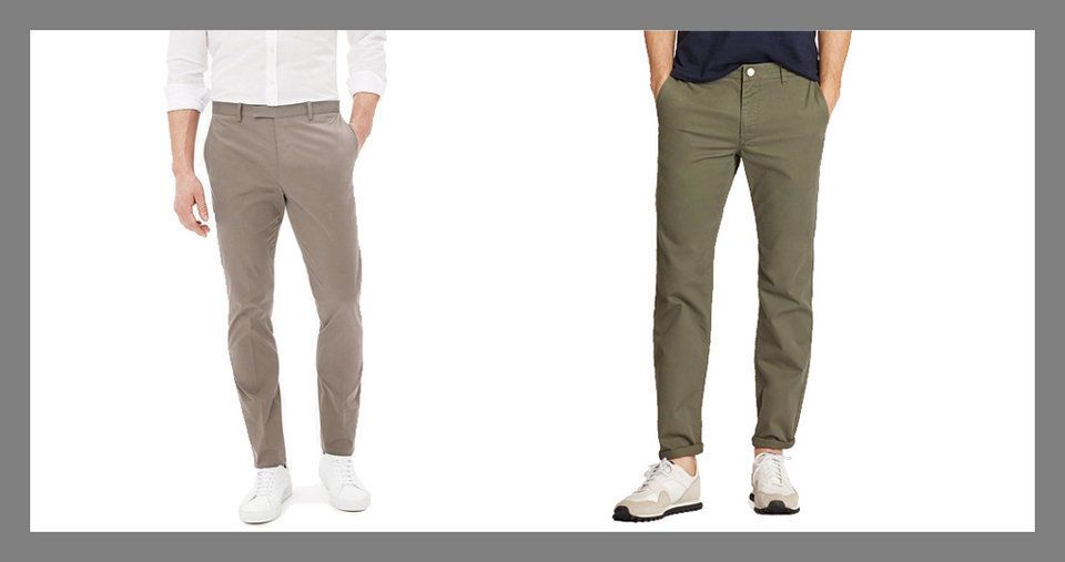 زوج من سراويل تشينو -A pair of chinos- يمكنك ارتداء هذه السراويل عندما تشعر أنك لست بمزاج مناسب لارتداء الجينز، وتعتبر هذه السراويل أنيقة للغاية بالإضافة إلى أنها سهلة الارتداء والخلع.