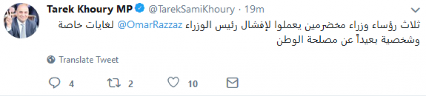 كتب النائب طارق خوري في حسابه على موقع التواصل الاجتماعي تويتر بأن هناك رؤساء حكومات سابقين يعلمون على افشال رئيس الحكومة الحالي الدكتور عمر الرزاز.