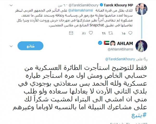 سرايا - أكدت الفنانة الإماراتية أحلام بانها ليست المرة الأولى التي تقوم بها باستئجار طائرة عسكرية ، موضحةً بانها هي من قامت ومن حسابها الخاص باستئجار الطائرة العسكرية لنقلها من العاصمة عمان إلى البتراء