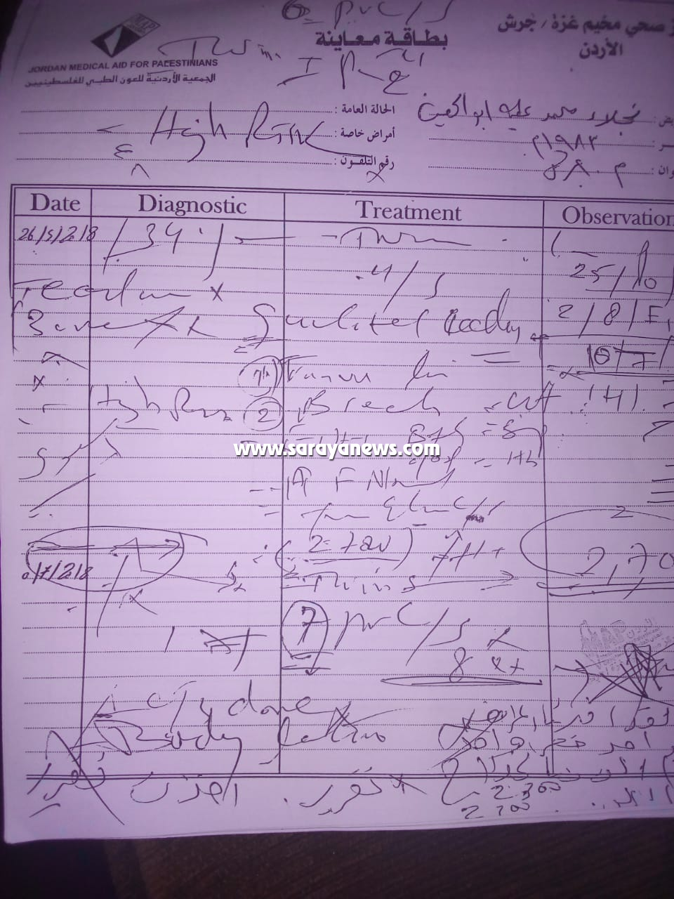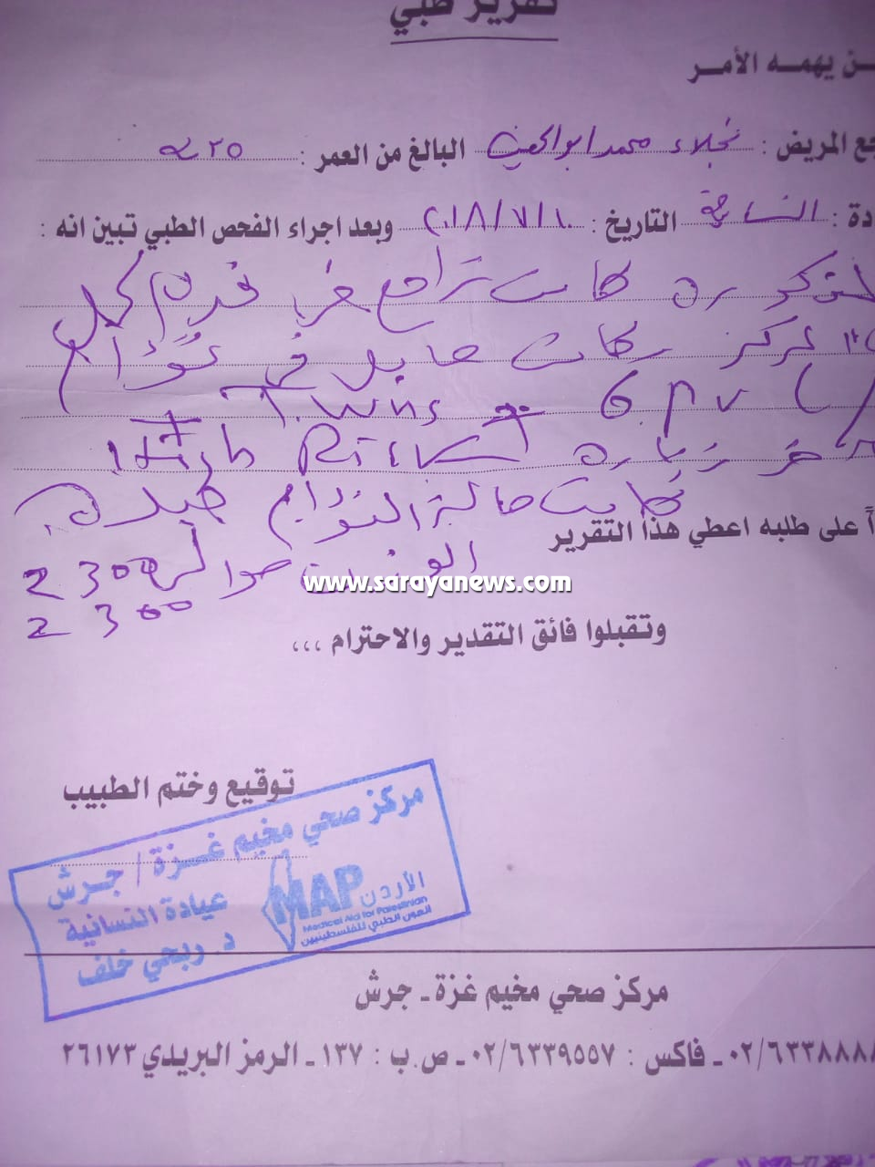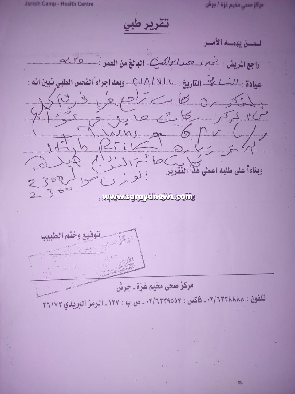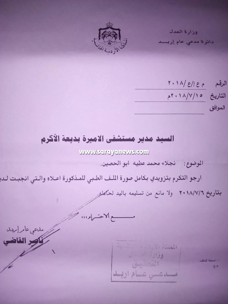 تابعت نجلاء.. "توجهت بعدها إلى الطبيب منذر في عيادته الخاصة ببيته وهو طبيب نسائية وتوليد بمستشفى جرش الحكومي بتاريخ: (23 ـ 06 ـ 2018م) وتم فحصي من قبله حينها، وأكد لي أن التوأم بصحة جيده وبين أن طفل منهم رأسه نازل في الحوض، وأضاف لي انه احتمال أن ألد في وقت قريب، ونصحني بالتوجه إلى مستشفى جرش الحكومي، لحجز موعد لعملية الولادة القيصرية كون ولاداتي السابقات صعبة ولا تتم إلا بالعملية القيصرية، واتصلت على المستشفى في يوم ثلاثاء وأعطوني موعدا لعيادة الدكتور هاني بتاريخ: (3 ـ 07 ـ 2018م)".
