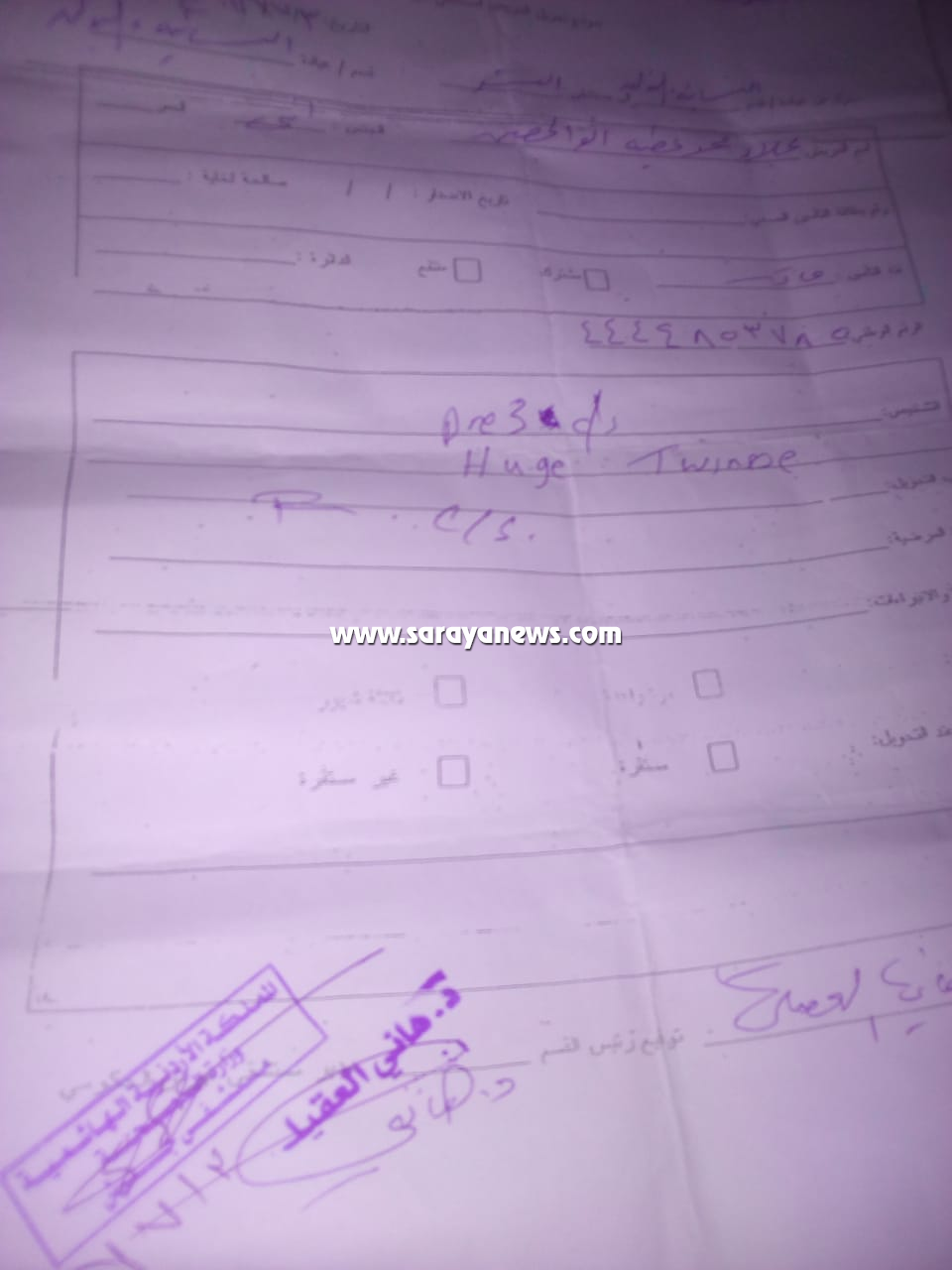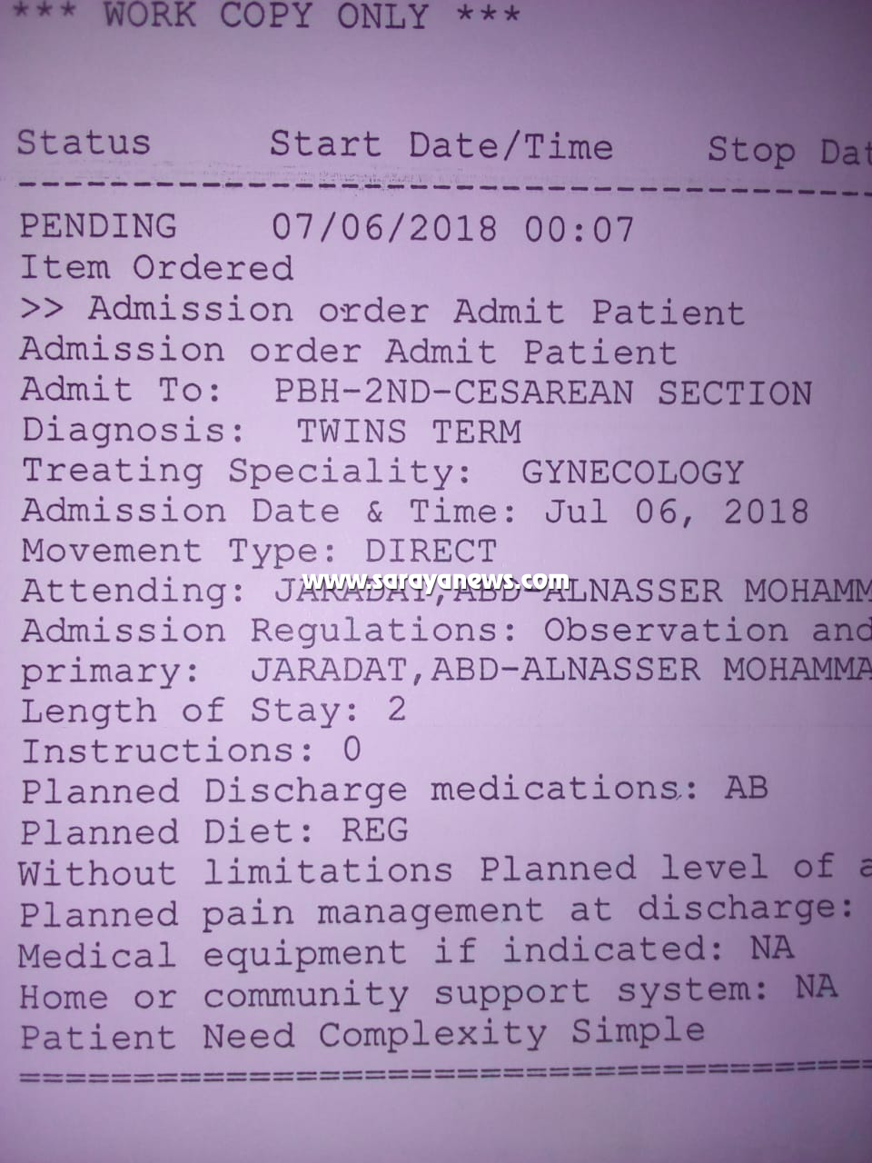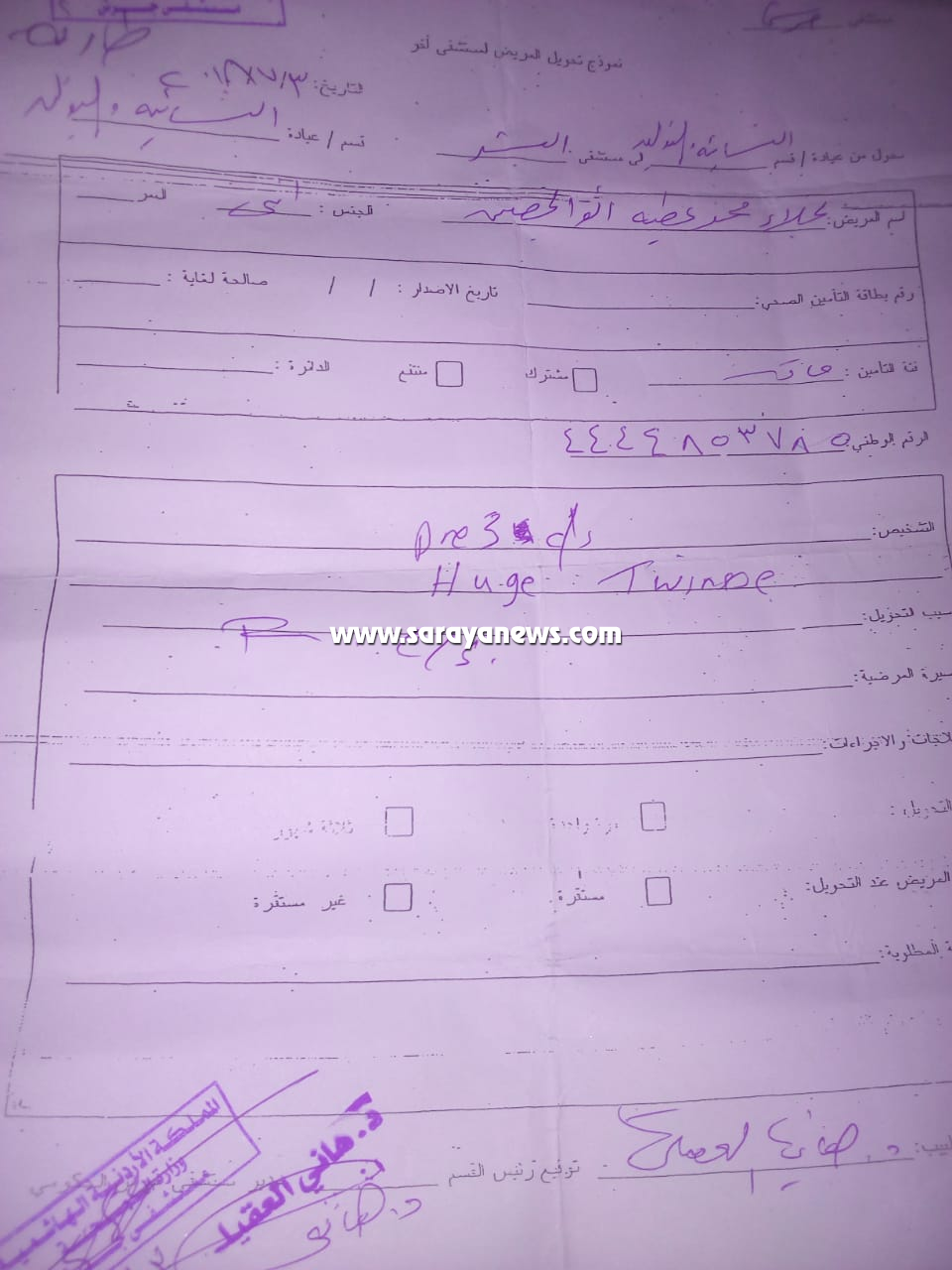 وتابعت نجلاء.. "ذهبت في (3 ـ 07 ـ 2018م) إلى عيادة الدكتور هاني العقيلي وفحصني سريريا من خلال جهاز (الالترا ساوند) وقال لي: إن التوأم وضعه جيد ودقات القلب لديهما جيدة، وأضاف قائلا لي: إنا ما بقدر أعملك العملية أنتي حامل بتوأم وعندك ولادات قيصريه سابقة وأنا احتاج أكثر من دكتور وتخصص لمساعدتي في العملية هذه، وأعطاني تحويله طارئة إلى البشير، وقلت له بصير أروح اعملها في بديعة لأني أنجبت فيها مرات عديدة، فقال لي: ما في مشكلة روحي على بديعة".