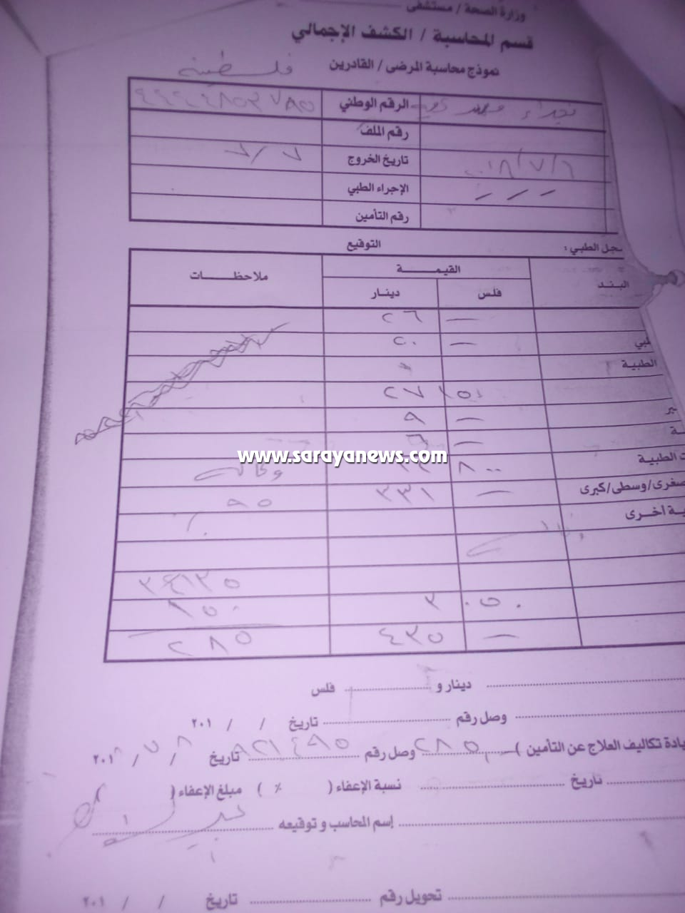 تابعت نجلاء.. "طبعا رفضوا دخول أمي أو زوجي للانتظار في الداخل كانوا خارج المستشفى، وطلبوا من زوجي وحدتين دم من مكان بعيد وهو بنك الدم الذي يبعد عن المستشفى مسافة الساعة وذهب مشيا على الأقدام ولم يعرف مكان بنك الدم وعاد ليجد رجل من السجلات فقال له: "إنني لم أجد المكان"، فرد عليه الموظف: "خلص إنسي الموضوع هسه/الآن بكون خلصوا وعملوا لها العملية ما عليك أحنا بندبر الموضوع.."، وأضافت نجلاء: علما أنهم لم ينتظروا زوجي للتوقيع على موافقة العملية ووقعوا والدتي على النموذج ولم ينتظروه ولم ينتظروا منه جلب الدم، رغم إن عمليتي ليست طارئة".