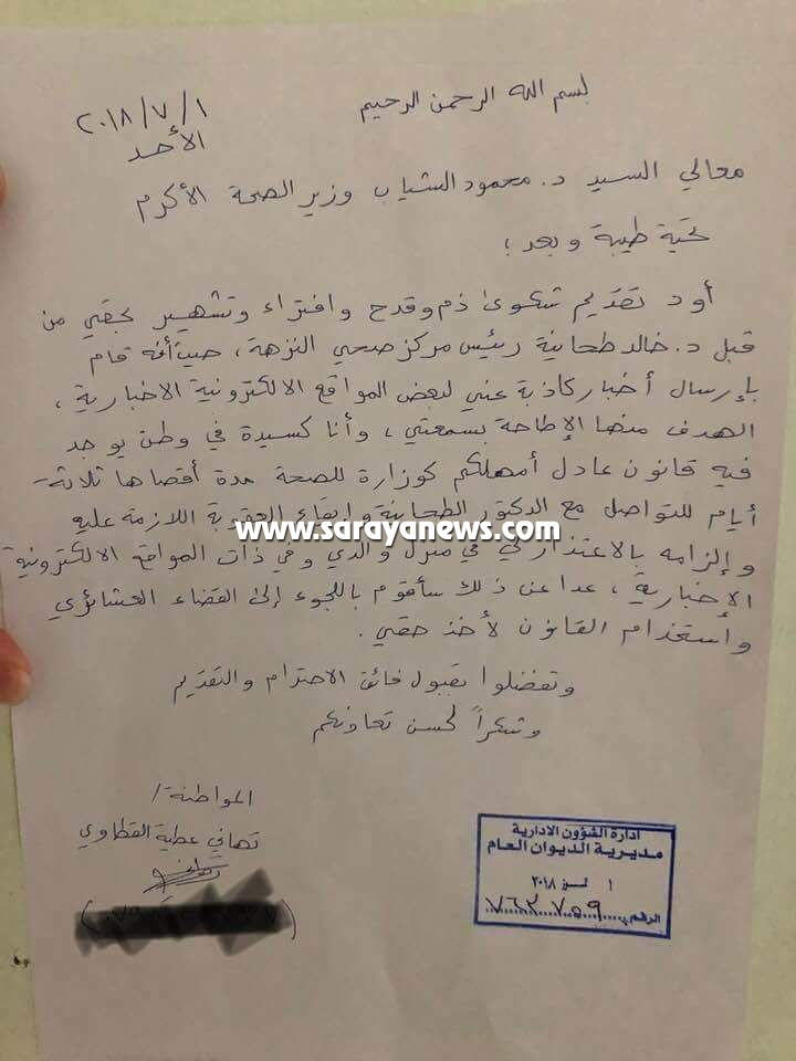 وتقول المعلومات ان الزميله قامت بتقديم شكوى لمكتب وزير الصحه ولم يتم اتخاذ اي اجراء الى ان جاء يوم الاشتباك الذي ظهر في الفيديو الذي تنشره سرايا والذي اظهر شخصا قد اشتبكت معه الزميله محاولة اخذ هاتف اصر على عدم اعطاءه للزميله ثم تعمد الصعود الى سيارته بطريقة استفزازيه واغلاق الطريق على سيارة الزميله ولم يعرف فيما اذا كان من ظهر في الفيديو المشار اليه هو رئيس المركز الصحي ام لا .