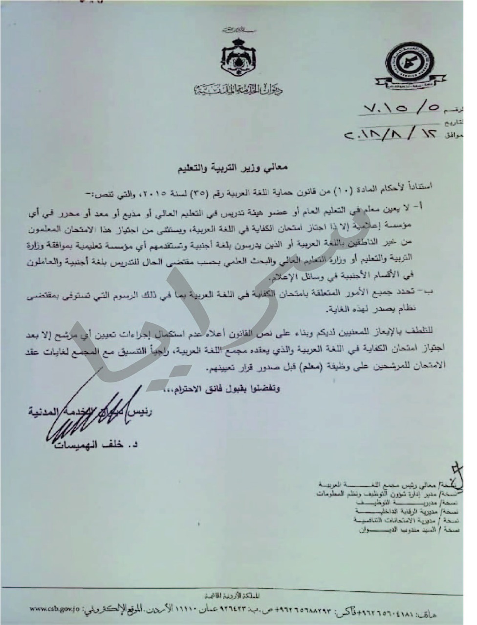 خاص - وجه الدكتور خلف هميسات رئيس ديوان الخدمة المدنية ، كتابا الى وزير التربية والتعليم يلزمه بعدم تعيين أي معلم في التعليم العام أو عضو هيئة تدريس في التعليم العالي أو مذيع أو معد أو محرر في أي مؤسسة إعلامية إلا إذا اجتاز امتحان الكفاية في اللغة العربية.