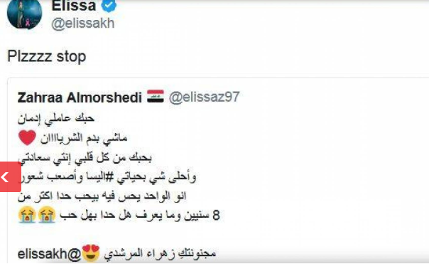 وكتبت اليسا على تعليق الشابة التي تدعى "زهراء" باللغة الانكليزية: "رجاء توقفي، أعرف كم تحبيني وأنا أحبك كثيرا ولكن إيذاء نفسك لن يساعد في إثبات وجهة نظرك. توقفي لأنه لن يجعلني مرتاحةً وسأنزعج لرؤية شخص ما يؤذي نفسه".