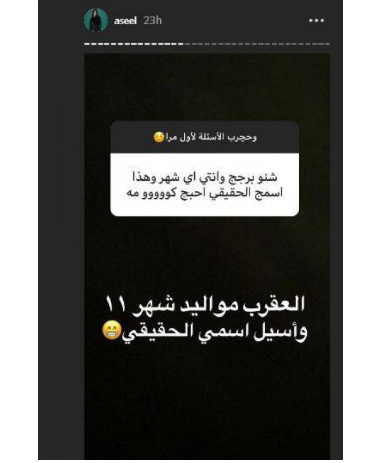 وأشارت الى أن "الظلم والنفاق وقلة الأدب"، هي أكثر الصفات التي تكرهها في الناس، لافتة الى أنها من مواليد شهر 11 وبأن إسمها الحقيقي هو أسيل.