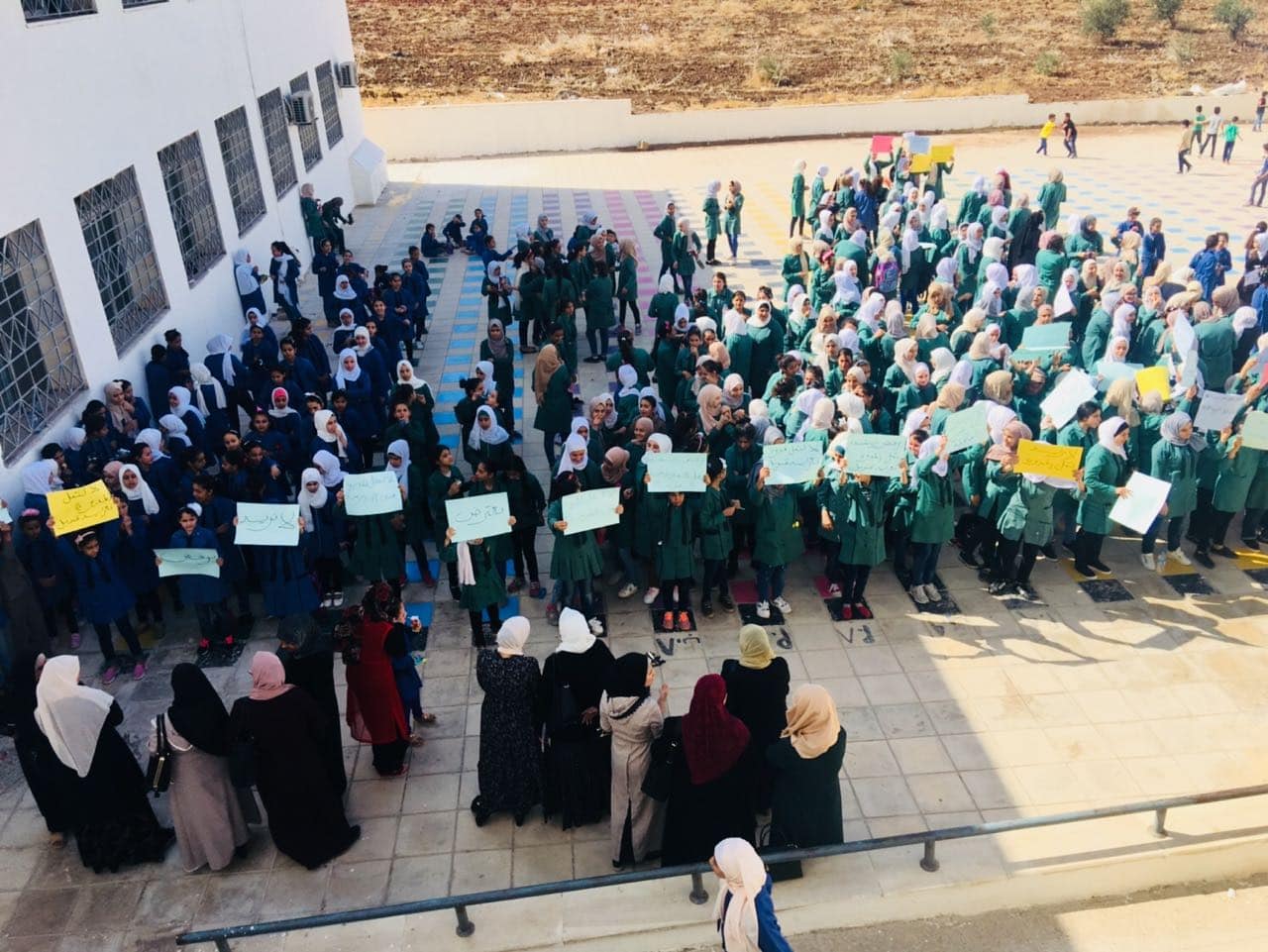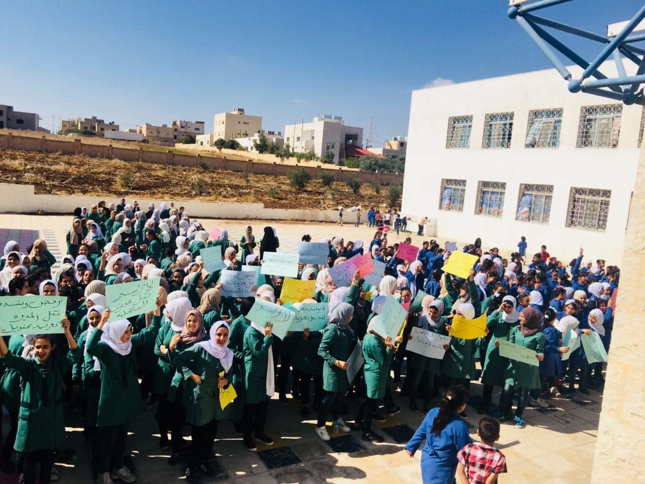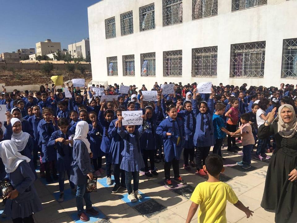 خاص - نفذت طالبات مدرسة فاطمة بنت اليمان في قصبة اربد اعتصاماً احتجاجياً رفضاً لقرار نقل مديرة المدرسة تغريد حسن قنديل بالتزامن مع بداية العام الدراسي الحالي 2018/2019.