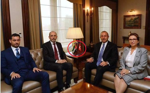 وتداول ناشطون عبر مواقع التواصل الاجتماعي صورة للوزيرين في احد اللقاءات الثنائية مع الجانب التركي، ويظهر في الصورة العلم الاردني بالمقلوب ، من غير ان ينتبه له الوزيرين او يصدر منهما اي تعليق