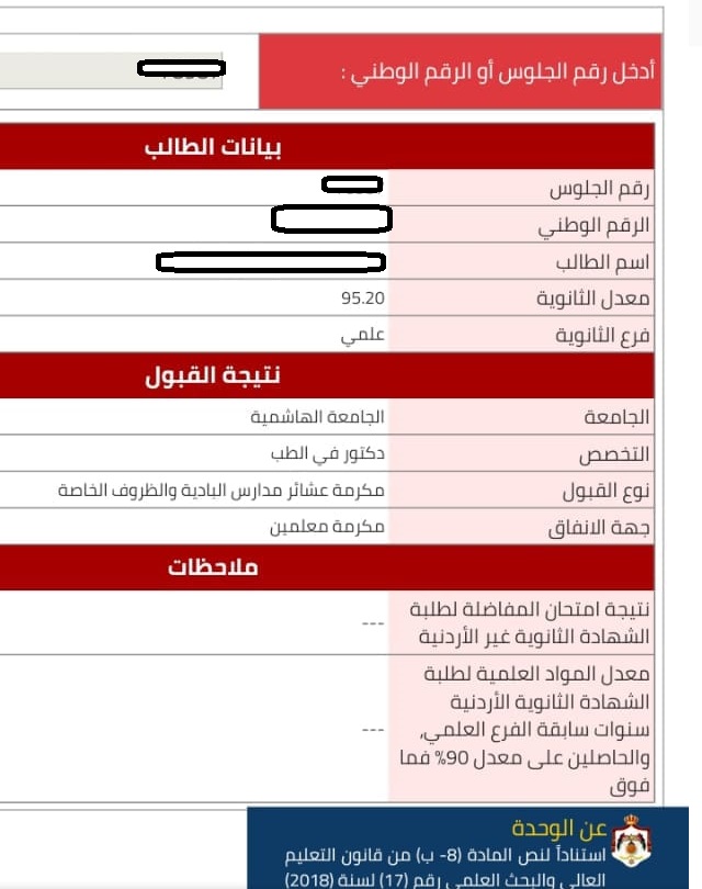 وفي التفاصيل قالت والدة الطالبة لسرايا انه وبعد السير باجراءات التسجيل بالقبول الموحد بشكل رسمي وحسب المتطلبات لهذه الغاية ، تم قبول ابنتها لتدرس الطب بالجامعة الهاشمية لحصولها على معدل (95.20) في التوجيهي ، على حساب مكرمة المعلمين .