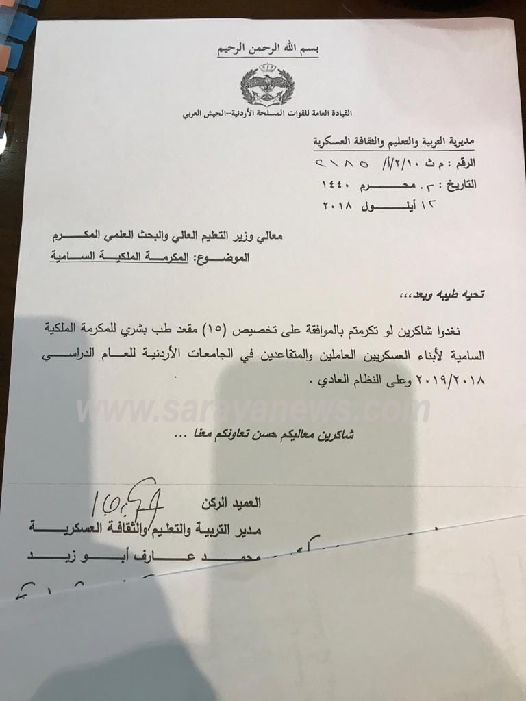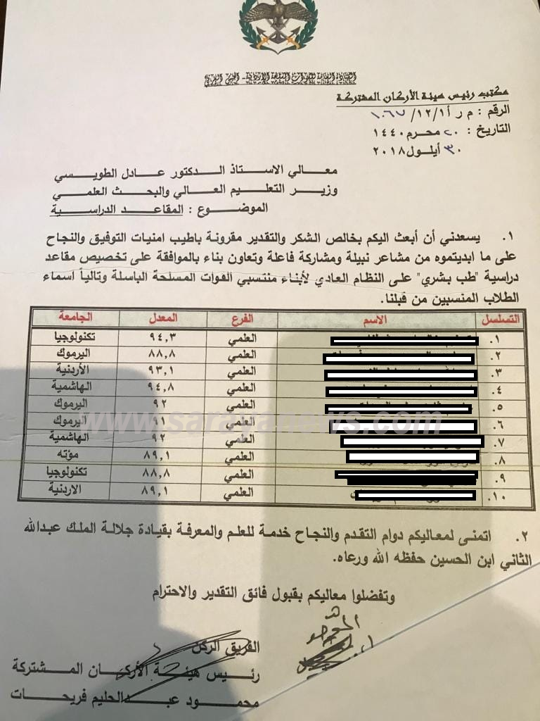 وأضاف الطويسي إن هذه الأسماء، تمثل قائمة إضافية، ضمن المكرمة الملكية السامية لأبناء العسكريين العاملين والمتقاعدين في القوات المسلحة.