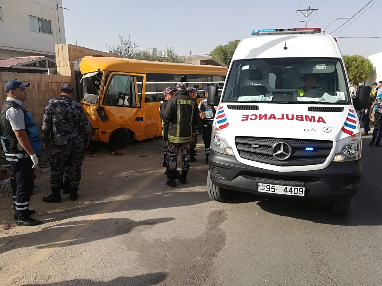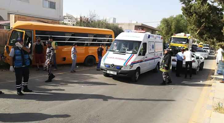 وذكرت إدارة الإعلام في الدفاع المدني أن كوادر الإنقاذ والإسعاف في مديرية دفاع مدني شرق اربد تعامل ظهر الاحد مع حادث تصادم وقع ما بين باص طلاب تابع لإحدى المدارس الخاصة ومركبة صغيرة بمنطقة الرمثا، حيث نتج عن الحادث إصابة (11) شخص برضوض في مختلف أنحاء الجسم .
